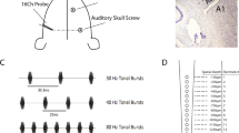 Acoustic stimuli were generated in Matlab, transferred to a RP2.1-based sound delivery system (TDT) and sent to a Fostex speaker (FE87E). The speaker was placed at 2 cm from the rat’s right ear, a distance at which the speaker produced a flat spectrum (± 3 dB) between 140 Hz and 36 kHz. Calibration of the speaker was made using noise and pure tones recorded by a Bruel and Kjaer microphone 4133 coupled to a preamplifier B&K 2169 and a digital recorder Marantz PMD671. Spectro-temporal receptive fields (STRFs) were determined using 97 gamma-tone frequencies, covering eight (0.14–36 kHz) octaves presented at 75 dB SPL at 4.15 Hz in a random order. The frequency response area (FRA) was determined using the same set of tones and presented from 75 to 5 dB SPL in random order at 2 Hz. Each frequency was presented eight times at each intensity.