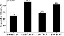 Transferrin saturation was lower in the mild and moderate groups than in the controls (p < 0.05). However, the values did not differ significantly among the three groups (p > 0.05).