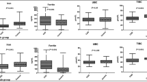 Five indicators, including serum iron (SI), total iron binding capacity (TIBC), ferritin, transferring (Tf), and transferrin saturation (TSAT%), were assessed in the study. These indicators are commonly used in clinical practice and are easy to detect. 2 ml blood samples were taken after fasting for at least 8 h. The serum and blood cells shall be separated within 2 h after collection, and the detection shall be completed within 8 h. If the process could not be completed in time, the serum samples should be stored at 2–8 °C. Serum iron and TIBC were detected by Beckmann AU5800 biochemical analyzer. Ferritin was detected by Roche Cobas e602 Automatic immune analyzer. Transferrin and TSAT% were detected by BN II specific protein analyzer. All assays were performed according to the instructions of relevant instruments by an investigator blinded to the case–control status.