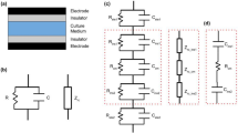 A first numerical study on the effect of electrical stimulation on the membrane has been presented by Taghian et al.18 using a 2D domain of \({50}\,\upmu \hbox {m}\) height and \({100}\,\upmu \hbox {m}\) width with an abstract cell model (Fig. 2). The capacitive coupling in this model can be understood in terms of an equivalent circuit model. Two capacitors (\({1}\,\upmu \hbox {m}\) thick insulation covering the electrodes) are connected in series with a parallel RC circuit (\({48}\,\upmu \hbox {m}\) thick cell culture medium filling the space between the electrodes)18. We used the analytical formula for the impedance of a cylindrical, (lossy) dielectric