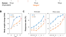 We identified female-specific downregulation of Htr3b following VCR exposure in the bladder. Htr3 receptors are assembled in homomeric α subunits (Htr3a) or heteromeric complex formed by α and β subunits (Htr3a/b). It has been shown that Htr3a/b receptor displays a larger single channel conductance and response amplitude than Htr3a homomer receptor, and Htr3b subunit facilitates the stable expression of the Htr3a/b receptors on the cell membrane16,17. Lines of evidence suggest that Htr3 plays a pivotal role in bladder afferent excitability, and inhibition of Htr3 increased bladder capacity under both normal and pathological conditions18,19,20. In the Ls-DRG, we observed a female-specific downregulation of Cav1.2 gene which has been shown to play an important role in pain processing, neuropathy-associated mechanical hypersensitivity21. Altogether, we consider that the VCR-induced downregulations of Htr3b compromises Htr3a/b channel activity in the bladder coinciding with a decrease in Cav1.2 in the Ls-DRG, thus impairing the bladder afferent firing and causing decreased bladder sensation in female mice. As such, the animals did not experience urges to urinate until the bladder was filled to the maximum capacity, which resulted in the increases in intravesical pressure and functional bladder capacity following VCR exposure. The increased NVCs without detrusor overactivity in vitro observed in VCR-treated female mice appears to be another sign that the bladder was reaching maximum capacity. Meanwhile, VCR exposure induced an elevation of IL-2, Itga1 and Trpa1 in the bladder and P2×4, P2×7, IL-2 and CD68 in the Ls-DRG in male mice. IL-2 has pleiotropic immune functions; acts as an immunostimulatory and immunoregulatory cytokine. Studies demonstrated an elevated IL-2 expression in neuron and glia in patients with degenerative neurological disorders, suggesting that IL-2 plays a role in neuroinflammatory pathways and the disease process22,23. CD68 is a common marker for activated macrophage lineage cells including microglia in central nervous system and associated with neurodegenerative disorders24. The robust nerve injury-induced macrophage expansion in the lumbar DRG and its contribution to mechanical allodynia has been reported in males but to a much less extent in female mice25. Accumulating evidence implicates that P2x4 potentiates P2x7-dependent release of proinflammatory cytokines including IL-1β, IL-6 and Tnfα in both central and peripheral nervous systems, leading to neuroinflammation, which contributes to induce neuropathy and abnormal nociception26. Studies demonstrated that CD68, P2x4 and P2x7 are expressed in the satellite glial cells (SGC) and macrophages in sensory ganglia, and that the DRG macrophages and SGCs contribute to nerve fiber damage, nerve injury induced neuropathic pain and CIPN27,28,29,30. We observed a male-specific trend of upregulation of IL-1β, IL-6 and Tnfα in the Ls-DRG following VCR exposure. Therefore, we consider that VCR induced inflammatory responses at least partly through the P2x4-P2x7 pathway in the Ls-DRG in male mice, which disturbed the bladder sensation similar to the mechanical hyposensitivity observed in the von Frey tests. Such hyposensitivity led to increases in the functional bladder capacity and bladder compliance in male mice. Itga1 is expressed in a wide variety of cells including immune cells, fibroblasts, and smooth muscle cells. Studies suggested that Itga1-expressing tissue resident immune cells produce high levels of proinflammatory cytokines and IL-2 and IL-15 stimulate their cytotoxic potential31,32. As such, Itga1 may be involved in VCR-induced neuroinflammation in the bladder in male mice. Future experiments should be conducted to test this hypothesis. Integrin α1β1 receptors (heterodimers of Itga1 and β1 subunit) serve as cell-surface receptor for collagen IV and laminin, involved in cell–cell adhesion, inflammation, and fibrosis. Studies showed that Itga1 was induced in smooth muscle cells upon differentiation from myogenic progenitor cells33, and Itga1 ligands promoted survival and a contractile phenotype of smooth muscles34,35. Based on the data that male mice who received VCR tended to have increased bladder size despite significantly reduced growth compared to the control group and increased expression on DSM cells, we speculate that Itga1 upregulation promotes survival and maintaining contractile function of DSM cells in the male bladder. Trpa1 channels expression was reported in the urothelial and DSM cells and bladder afferent nerves. Urothelial Trpa1 channels facilitate release of neurotransmitters including ATP and acetylcholine which activate receptors on afferent nerve terminals, interstitial cells, and DSM cells36. Studies demonstrated that Trpa1 plays a major role in detrusor overactivity as well as mechanosensory and nociceptive dysfunction in pathological states, particularly, with inflammation37,38. We surmise that the VCR-induced inflammation responses enhanced Trpa1 expression and signaling, resulting in detrusor overactivity in male mice.