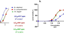 The larvicidal activity of Ar. argyi essential oils and their four dominant compounds against An. sinensis larvae was tested according to the method introduced by Nyamoita59. The range of lethal doses for the investigated samples was determined using the doses at 20, 40, 60, 80, 100 and 120 μg/mL, respectively, and a total of three replicates were conducted. Ethanol was used as the control. Different dosages of samples were added to a 50-mL cup containing a total of 20 mL of dechlorinated water. Twenty 4th instar larvae were then gently moved to the cup and the bioassay was performed under room temperature at 27 ± 1 °C with an 80 ± 10% relative humidity. The number of larvae with no movement (after touching) were considered as dead and were counted after 24 h of exposure.