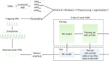 The publicly released UBFC-RPPG47 dataset was used for training; this dataset is specifically designed for remote HR measurement tasks, and contains 42 one-minute long videos from 42 different subjects. All participants provided consent for the publication of identifying images in an online open-access publication. The videos were recorded using a Logitech C920HD Pro camera with 30 fps and a resolution of 640 × 480 pixels in an uncompressed 8-bit RGB format. Each subject was made to sit in front of a camera at a distance of approximately 1 m. Subjects were required to play a time-sensitive mathematical game, which caused variations in their HRs. The video recorded the natural rigid and non-rigid movements of the subjects. During the video recording, a transmitting pulse oximeter CMS50E-based PPG signal was simultaneously measured from a finger to obtain a reference HR, denoted \(HR_{true} \left( t \right)\). Pulse peaks in the reference HR were identified and inter-beat intervals were calculated, which were then resampled to 4 Hz by fitting a cubic spline to obtain continuous HR values.