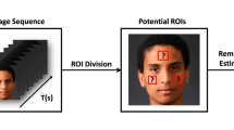 The red, green, and blue values in the (i, j) pixel from the original image in the k-th frame were denoted by \(R_{k}^{ij}\), \(G_{k}^{ij}\), and \(B_{k}^{ij}\), respectively, and the red, green, and blue values in corresponding pixels in the face skin image at the \(k\)-th frame were denoted by \(R\left( f \right)_{k}^{ij}\), \(G\left( f \right)_{k}^{ij}\) and \(B\left( f \right)_{k}^{ij}\), respectively. Then, \(R_{k}^{ij}\), \(G_{k}^{ij}\) and \(B_{k}^{ij}\) can be expressed as: