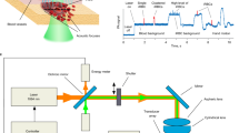 Significant progress has been achieved in disease diagnosis using advanced lasers1. Among different laser methods, photoacoustic (PA) techniques have shown advantages in sensitivity, noninvasiveness, and depth penetration in biotissue up to 3 to 5 cm2,3,4. Several PA imaging devices have demonstrated promising clinical results in vivo in humans, including in the assessment of Crohn’s disease status5, diagnosis of breast cancer6,7, and monitoring of blood oxygenation in jugular veins8. The diagnosis of these and many other medical conditions often begin with the examination of a patient’s blood; however, existing blood tests are unable to provide early diagnosis because their sensitivity is limited by the small blood volume collected (typically 5–10 mL for venous and a few μL for capillary samples), which misses up to 103 to 104 of the abnormal cells or biomarkers in the entire blood volume (~ 5 L in adults)9. This large portion of missed cells can result in disease progression that is too difficult to treat, such as metastasis, sepsis, or stroke formed by circulating tumor cells (CTCs), bacteria, and clots, respectively9,10. In particular, despite enormous efforts in the development of diverse CTC assays, they are not yet recommended for clinical use because of their low sensitivity, inconsistent data, and as a result, have unclear diagnostic value, especially for early disease diagnosis10,11. In addition, most existing PA techniques, especially PA imaging, are unable to detect fast-moving, circulating disease biomarkers with typical velocities of 5 to 10 cm/s, even if present in subcutaneous vessels, further limiting their utility10.