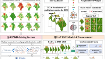 The biomass method, stock volume method, chamber method, and sampling method have relatively high accuracy in estimating carbon storage12, but it is difficult to reflect carbon storage changes over long time series and large scales13. The InVEST model provides new technology for conducting spatial expression, dynamic analysis, and quantitative evaluation of ecosystem service function14. More importantly, the InVEST model can easily be used to assess the impact of climate and LUCC changes on ecosystem carbon storage11. Changes in LUCC alter the structure (biomass, species composition) and function (energy balance, carbon cycle, biodiversity) of the ecosystem. The Carbon module of InVEST Model takes land use data as the main data source and is suitable for large-scale and long-term carbon storage estimation, so it is widely used in carbon cycle assessment and simulation of terrestrial ecosystems at different scales15,16,17. For example, Clerici et al. used the InVEST model to assess the impact of LUCC and climate change on carbon sequestration services in the Andes Mountains of Colombia18. Based on this model, He et al. evaluated the impact of urban expansion on regional carbon emissions and believed that the model is suitable for evaluating the impact of urban expansion on ecology after verification19. Li et al. evaluated the carbon storage change in the Loess Plateau and believed that carbon density has a strong spatial correlation with NDVI2. There are also studies combining CA-Markov, CLUE-S and other models to predict the future change trend of carbon storage13,20. In general, the research results of regional carbon storage assessment based on InVEST model are abundant, which provides an important basis for dynamic monitoring and evaluation of regional ecosystem service function.