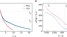 For glass synthesis, a bead of 83TiO2-17Nd2O3 was levitated and melted (\(T_{m}\) = 1467°C16), and then the laser was turned off to achieve rapid cooling. Two examples of beads’ cooling behavior are shown in Fig. 1. As the levitated liquid bead cools, the supercooled liquid may cool below \(T_{g}\) (786°C1) to form a glass (Fig. 1a, blue curve), or recalescence may occur before the droplet reaches \(T_{g}\) (Fig. 1a, green curve), signifying latent heat release during crystallization, which momentarily raises the sample temperature to near \(T_{m}\). Crystallization from the supercooled liquid was often observed if the cooling rate was not sufficiently large, which necessitated the use of small beads no larger than ~ 11 mg or ~ 1.6 mm in diameter. For these bead sizes, the cooling rate (Fig. 1b) was typically > 1000 °C s−1 above 1800 °C and then declined as the bead cooled and radiative contributions to heat transfer lessened. Cooling rates were ~ 600 °C s−1 near \(T_{m}\) and ~ 250 °C s−1 near \(T_{g}\) (Fig. 1, gray vertical arrows). Glass beads were transparent with a strong purple hue and, in most cases, free of voids or bubbles (Fig. 1a, inset).
