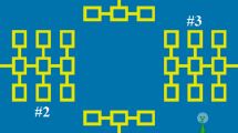 In consideration of high isolation between excited port and radial decoupling stubs, and the fact that tunable circuits and devices are placed on the back of antenna which has ignorable effect for entire array, we expand the above 4 elements model to a panel antenna structure which includes 8 by 4 elements and is shown in Fig. 5. The SIW power dividers are applied and optimized for the integration with the slot array. As denoted in Fig. 5a, each of two power dividers adapts a classical T-junction design, where the densely distributed through-holes define the side-walls of the T-junction32,33,34. It is seen that the cascade of three T-junctions divides the power into \(2^{3}\) equal parts at the input side and combines them into one channel at the output side, as depicted in Fig. 5a. The back of antenna exists such decoupling stubs, and each of them can individually control the on/off state of the corresponding slot antenna element by changing the bias voltage that is applied to the diodes. In simulation, the change in the state of the diode are imitated by setting the lumped resistance for each diode, as done in Figs. 3 and 6. In practical sample, each stub is supplied by a lead which is connecting with an individual signal channel in the FPGA controlling unit, as shown in Fig. 8b.
