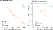 For analyses of detection time, we included failed trials where the carcass fate was unclear (See “Results”) as long as the carcass was detected before the trial failed (i.e., we counted trials where the carcass was partially scavenged before it was removed from the frame as “detected”). We used the R package “survival”65 to calculate the probability of a carcass being detected over time. We used a log rank test to calculate χ2 for observed and expected events for each time step to evaluate the effects of carcass size, habitat, and human activity zone on detection. To test the effect of rain on carcass detection by vertebrate scavengers, we determined the presence or absence of rain while the carcass was still present by examining the time lapse photos and included the categorical variable rain (yes/no) in our models.