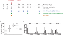 In parallel, the early modulation of the intestinal microbiota is already promoted to improve intestinal health of chickens19,20. Studies report the effects of microbiota modulatory compounds such as probiotics: Anaerosporobacter mobilis or Lactobacillus reuteri impact the outcome of vaccination against Campylobacter jejuni21,22. Moreover, variations in the commensal gut microbiota composition can affect adaptive immune responses in vaccinated chickens, with higher hemagglutination titers in chicken submitted to a probiotic treatment based on several Lactobacillus species in comparison with antibiotic treated chicken23. A few recent studies report also the effect of vaccination on the gut microbiota, for instance against Salmonella24. In addition, vaccines with attenuated Eimeria have been shown to diminish the microbial diversity and Firmicutes relative abundance in broilers25,26. The interactions between vaccination and the gut microbiota remain to be studied for a larger set of pathogens, and for different types of vaccines.