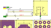 where \(P_{L}\) and \(P_{w}\) is the patch length and width, c denotes the velocity of light, \(\gamma_{r}\) is the substrate dielectric constant, \(\gamma_{reff}\) indicates the effective dielectric value of the radiating patch, and \(\Delta L\) denotes the change in patch length. The antenna backplane is optimized in the second step, which increases impedance bandwidth, despite the very low − 10 dB value. In the third step, the position of the feed line is shifted to the right which improves the impedance bandwidth and impedance matching38 of the suggested antenna. The antenna exhibited excellent working bandwidth of 4 GHz during this phase while also covering the sub-6 GHz frequency spectrum in 5G. The fourth and final stage incorporates etching the square slots in the diagonal corners of the radiating patch. This slot expands the bandwidth of 4.56 GHz substantially, encompassing the 5G sub-6 GHz spectrum between 3.11 GHz and 7.67 GHz, as depicted in Fig. 3b. The front and bottom perspectives of the suggested design are indicated in Fig. 3a and the final optimized desired design parameters are as follows: SL = 40 mm, Pw = 18 mm, PL = 18 mm, gL = 12 mm, fL = 11 mm, fW = 4.7 mm, c1 = 2 mm, c2 = 9.65 mm, and c3 = 1.65 mm.
