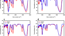 The FT-IR analysis was used for detecting the prosperous incorporation of Fe3O4-NPs into chitosan beads and the potentiality of dye adsorption using MchiBs (Fig. 4B(a–c)). The peak at 3438 cm-1 could attribute to the N–H and O–H overlapping stretching vibrations28. The absorption bands observed at 2923 cm-1 and 2853 cm-1 could respectively ascribed to the O–H and C–H stretching vibrations of alcohol, carboxylic and alkane groups. Two peaks at 1383 and 1027 cm-1 are corresponding to C–N and C–O stretching bands, respectively. A peaks at 1641 and 1148 cm-1 were assigned, respectively, to C=O stretching vibration of amide group and C–O–C of glycosidic bridge. In the MchiBs spectrum, a very low intensity peak at 1083 was determined which is related to Fe–OH stretching vibration. The peak at 527 cm-1 related to the stretching band of Fe–O group. Reactive red 198 selected for studying the decolorization capability using the MchiBs (Fig. 4c). The appearance of some new peaks at a range of 400–700 cm-1 may attributed to the successful adsorption of dye onto the chitosan- Fe3O4-NPs beads. The peaks become generally broad with slight shift and the intensity decreased after the sorption of dye onto MchiBs. Overall, the FT-IR spectra ascertained the incorporation of Fe3O4 nanoparticles into chitosan beads and the successful biosorption of dye by MchiBs. Similar results have reported by other researchers1,4,34,35.