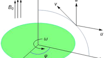 Here \(\left( {V_{r} , \, V_{\phi } {\text{ and }}V_{z} } \right)\) in the above equations represents the constituents of fluid velocity in the radial, tangential and axial directions, \(\left( \rho \right)\) indicates the fluid density, \(\left( {C_{p} } \right)\) indicates the specific heat capacity, \(\left( {B_{0} } \right)\) represents the magnetic field intensity, \(k(T)\) stands for thermal conductivity, \(\left( \mu \right)\) indicates the dynamic viscosity, \(\left( T \right)\) denotes the temperature of fluid, \(\left( \sigma \right)\) represents the electrical conductivity, \(\left( {T_{\infty } } \right)\) represents the free stream temperature and \(\left( {Q^{*} } \right)\) stands for coefficient of heat generation/absorption . The stress tensor components are given as: