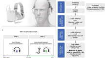 The study recruited participants with chronic subjective tonal tinnitus. Chronic subjective tinnitus is a phantom auditory percept that is attributable to abnormal firing patterns in the brain1. Subjective tinnitus differs from objective tinnitus, which is typically associated with sounds generated from vasculature or pulsation anomalies, abnormal muscle contractions or head/jaw movements1. For screening, participants who were between the age range of 18 and 70 years and with a tinnitus duration between 3 months and 10 years were included in the study. We recruited participants with THI scores of 38 to 100 points and a Minimum Masking Level (MML) measurement between 20 and 80 dB HL. MML was determined by presenting a wide-band noise at increasing intensities until the sound stimulus masked the participant’s tinnitus. We required that the candidates have a maximum hearing loss of 40 dB HL in the measurement frequencies in the range of 250 Hz to 1 kHz or of 80 dB HL in the measurement frequencies in the range of 2–8 kHz for both ears. To be eligible, participants had to be able to read and understand English and provide informed consent. They were also required to be willing to commit to the full duration of the study.