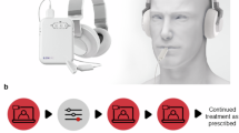 In 2020, results from a large randomized and blinded clinical trial for bimodal neuromodulation (TENT-A1 study; clinicaltrials.gov: NCT02669069) with 326 enrolled participants supported the safety and efficacy of combined sound and tongue stimulation therapy using the Lenire device (Fig. 1a; CE-marked Class IIa medical device; Neuromod Devices, Ireland)11. The TENT-A1 study showed that bimodal neuromodulation reduced tinnitus symptom severity scores in more than 80% of participants during the 12-week treatment period that could last for 12 months after the treatment ended. The scores were based on two widely used and validated outcome instruments: Tinnitus Handicap Inventory (THI) and Tinnitus Functional Index (TFI)17,18,19,20. About two-thirds of the participants also reported that they had benefitted from the tinnitus treatment based on exit interview questions. These outcomes were consistent across all three treatment arms in the study that included different parameter settings, and there were no significant differences between arms. As detailed in the published TENT-A1 manuscript11, “arm 1 (PS1 setting) consisted of synchronized sound and tongue stimulation. A pure tone (ranging approximately from 500 to 8000 Hz, with repetition period of about 80 ms) was presented at the same time that a train of pulses was presented to a specific location on the tongue. The stimulation location on the tongue array was fixed for a given pure tone frequency; this resulted in a fixed tone-to-tongue spatial mapping. Arm 2 (PS2 setting) used the same auditory stimuli as PS1 but had short interstimulus delays that varied in the range of 30–50 ms across each stimulus presentation and the tone-to-tongue spatial mapping was randomized across stimulus presentations. Arm 3 (PS3 setting) used lower frequency tones (approximately 100 to 500 Hz) with longer interstimulus delays (550–950 ms) than used in PS2.” All three parameter settings included background wideband noise and applied supra-threshold intensities for sound and tongue stimulation. These settings were fixed across the 12-week treatment period.