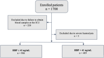 Change in plasma HBP was defined as the difference between a given timepoint and baseline (Day 1). In particular, we measured the 24-h plasma HBP change (HBPc-24 h) and the 48-h plasma HBP change (HBPc-48 h), both relative to the baseline (Day 1) measurement. The relative change of HBP was calculated by dividing the HBPc-24 h and HBPc-48 h by the baseline HBP, respectively, and was presented as a percentage. Baseline APACHE II score, Sequential Organ Failure Assessment (SOFA) score, primary source of infection, culture results, ICU, and hospital mortalities were recorded. Clinical parameters such as body temperature, heart rate, white cell count (WCC), and clinical signs of infection were recorded on admission and repeated daily22.