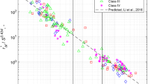 The variation of the dominant geotechnical properties of the bank materials across the three reaches was evaluated by using box plots (Fig. 6). The results show that the dominant geotechnical properties of the bank materials varied across reaches. The values of effective internal friction angle (\(\varphi^{\prime}\)) obtained from a series of UU triaxial tests generally decreased from Reach 1 to Reach 3 with a mean value of 31.3°, 26.9°, and 24.9° for Reach 1, Reach 2, and Reach 3, respectively (Fig. 6a). In contrast, the effective cohesion values (\(c^{\prime}\)) increased from Reach 1 to Reach 3 with a mean value of 3.4, 7.7, and 12.9 kPa for Reach 1, Reach 2, and Reach 3, respectively (Fig. 6b). Similar trends of geotechnical characteristics were observed in the plots of plasticity index (PI) and dry density (\(\gamma_{d}\)). The minimum and maximum values of PI in the three reaches were 5 and 26%, 18 and 30%, and 27 and 45% for Reach 1, Reach 2, and Reach 3, respectively (Fig. 6c). The box plots of \(\gamma_{d}\) for all the reaches were mostly symmetrical, suggesting that the mean is almost the same as the arithmetic mean. The mean values of \(\gamma_{d}\) in all the reaches decreased from 1.60 Mg/m3 for Reach 1 to 1.53 and 1.44 Mg/m3 for Reach 2 and Reach 3, respectively (Fig. 6d). Based on the grain-size distribution and Atterberg limits test results, the bank materials in Reach 1 can be classified as well-graded sand (SW), silty sand and clayey sand (SM-SC) following the Unified Soil Classification System (USCS). Also, Reach 2 bank materials can be classified as SC, low plasticity silt (ML), inorganic clay of low plasticity (CL), and organic clay of low plasticity (OL), while Reach 3 bank materials are essentially low plasticity silty clays (ML-CL) and inorganic clays and organic clays/silts of high plasticity (CH-OH). The variation in the dominant geotechnical properties of the bank materials could be attributed to the mean bank erosion rates determined from the three reaches during the three-year monitoring period46.