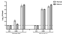 The results show that the dual-QAC disinfectants, MCP and FWD, are highly effective at inactivating Nipah virus within 15 s of contact time, even when they are diluted 1:9 (Table 2 and Fig. 1). The virucidal activity of FWD was found to be superior to that of MCP. For example, FWD diluted up to 27-fold completely inactivate Nipah virus in 15 s, while MCP at the same concentration required 1 min to completely inactivate Nipah virus. Neither of the dual QAC disinfectants completely inactivated Nipah virus when diluted 81 times (5%/81, ~ 0.06% final concentration), even after 8 min of contact time. But the reduction factor (Log10) of FWD (5%/81, 8 min) was greater than that of MCP evaluated at the same concentration and contact time, again indicating superiority of FWD over MCP for inactivating Nipah virus.