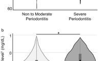 Questionnaire-based periodontal anamnesis was taken from all participants. Participants were asked about the frequency of dental and periodontist visits, dental plaque removal, frequency of washing their teeth and the use of oral hygiene products (e.g. usage of toothbrush, toothpick, dental floss, interdental brushes). They were also asked about the presence of symptoms such as bad breath, bleeding while brushing and loose teeth. A comprehensive periodontal examination was performed by an experienced periodontist (MR) using the UNC 15 mm periodontal probe (Aesculap, Tuttlingen, Germany). All clinical parameters measured on six sites were recorded: the full mouth plaque score (FMPS), bleeding on probing (BOP), probing pocket depth (PPD), gingival recession (GR) and clinical attachment level (CAL). Periodontal variables were considered periodontal stages according to the new classification scheme as it was proposed in the paper of Tonetti et al.51. Mild PD included stages I and II, while severe was classified as stages III and IV. If the participant reported a loss of > 4 teeth due to PD or had no teeth it was grouped within the severe PD group.