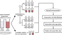 Following all experiments, decimal serial dilutions (from 10–1 to 10–7) were prepared. Subsequently, 100 µL of each dilution were seeded on the surface of Mueller–Hinton dishes (bioMérieux) in triplicate and incubated at 37 °C for 24 h (Fig. 1). The number of colonies was counted at the appropriate dilution and the number of CFU/mL were calculated and transformed in log10 scale.