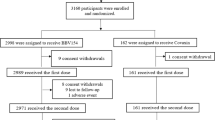 BBV152 is a whole-virion ß-propiolactone-inactivated SARS-CoV-2 vaccine adjuvanted with Algel-IMDG. The virus strain NIV-2020-770 was isolated from a COVID-19 patient, sequenced at the Indian Council of Medical Research-National Institute of Virology (NIV), and provided to Bharat Biotech International limited (BBIL)29, 42,43,44,45. The vaccine virus strain NIV-2020-770 contains the D614G mutation, which is characterised by an aspartic acid to glycine shift at amino acid position 614 of the spike protein42. The control arm received non-booster containing sterile phosphate-buffered saline and Algel-IMDG. Vaccine and control formulations were supplied as 0.5 mL doses in single-use glass vials which were stored between 2 and 8 °C. The appearances of vaccine and non-booster were identical. Vaccine and non-booster were administerd by intramuscular injection in the deltoid muscle.