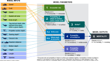 We used distance sampling methodology52 to estimate seasonal right whale abundance. To estimate effective strip width (i.e., the area effectively searched on each side of the aircraft), we fit a detection function to our sighting data using the R package ‘Distance’53,54. Fitting a detection function requires an adequate sample size, which is at least 25–30 sightings and ideally 60–80 sightings55. We did not have the required sample size to fit a detection function to each year of survey data. Consequently, we fit a detection function using right whale sightings from the entire study period (i.e., 2011–2019). Although previous studies38 have reported on right whale abundance for 2013–2015, those estimates used a detection function fit with all large whale sightings, and so we recalculate those years here. We used sightings collected during all survey effort because standard distance sampling protocols were followed during all surveys, although only broad-scale survey effort was used for abundance estimation. We left-truncated the data at 0.15 km because observers could not see directly below the aircraft. We visually assessed a histogram of sightings distances and determined that the data should be right-truncated at 1.8 km. Initial testing of environmental covariates (Beaufort sea state, glare, and visibility) showed that they did not affect detection distance so they were not included in final analyses. Hazard rate and half-normal models were used to evaluate detection probabilities as a function of perpendicular distance, and model fit was checked using a Chi-squared goodness-of-fit test.