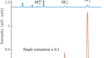 In the experimental set-up used, a ring magnet with a hollow conical pole-piece, located about 10 mm away from the light matter interaction point, provides a divergent magnetic field which collects essentially all electrons emitted in a solid angle of 4\(\pi \). A solenoid surrounding an about 2.2 m long electron flight tube creates a homogeneous field which guides the electrons towards a micro-channel plate detector at the end of the tube. The detector registers the flight time of the electrons relative to the pulsed light source, which are converted to energies based on an established calibration procedure relying on known single ionisation and autoionisation energies described below. The electron kinetic energy resolution for this setup is typically \(\Delta E\) \(\approx \) E/20 and the overall collection-detection efficiency is about 50%26. A few hundred nanoseconds after photoionisation, once the electrons have escaped the interaction region, an electric field is applied across the interaction region in order to accelerate the ions through the ring magnet in the opposite direction to the electrons. The ions travel through a 0.12 m long flight tube towards a second micro-channel plate detector. The electric fields are optimised to obtain Wiley–McLaren time focusing conditions28. The flight time for the ions is proportional to \(\sqrt{m/q}\), where m/q is the mass to charge ratio. The mass resolution is about \(\Delta m\) \(\approx \) m/40 for thermal ions and the ion collection-detection efficiency is about 10%. The number of accidental coincidences, where ions and electrons from different ionisation events are detected together, is reduced by keeping the ionisation rate in the interaction region below 2%.