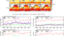In the previous section, we presented the numerical difference in the wave fields between W3with_ice and W3no_ice simulations and found that W3with_ice simulates accurate wave parameters. This section shows the local and remote implications of the SO sea ice concentration inclusion as an input field in the wave simulations. Figure 3d–g show the average sea ice concentration for different seasons used to force the model to run the W3with_ice simulation. Around 1,00,00 km2 area is covered with sea ice concentration in the southern sector of IO during SON, which acts as a large fetch area for wave generation in W3no_ice simulation. The area around 30–50° E and 70–50° S is considered a strong swell generating area14 with a fetch size of ~ 44,000 km2. In W3no_ice, the entire 44,000 km2 is available as fetch for swell generation, while in W3with_ice, ~ 46% of the area is ice-covered during SON (see Fig. 3g). Considering a fetch area of 44,000 km2, a friction velocity of 0.46 m/s at an average wind speed of 12 m/s, the average Hs calculated will be 1.27 m in W3no_ice using the following equation: