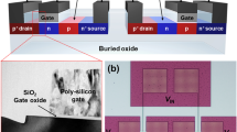 Figure 1c shows the transfer characteristics of the reconfigurable DG FBFETs in the n- and p-channel modes. In the n-channel mode (VPG = 1.00 V), as a VSD varies from −1.00 to −1.40 V, the ‘switching on’ voltage (Von) shifts from −0.24 to −0.64 V. Contrary, in the p-channel mode (VPG = −1.00 V), as a VDS varies from 1.00 to 1.40 V, Von shifts from 0.27 to 0.67 V. The shift of Von is owing to the decrease in the potential barrier height between the drain (or source) and program-gated region. Moreover, for both channel modes, the transistor exhibits a constant memory window of ~ 0.25 V regardless of VDS (or VSD). The transistor also exhibits an on/off current ratio of ~ 1012 and a subthreshold swing (SS) of ~ 0.4 mV/dec at a VDS (|VSD|) of 1.00 V for the p-channel (n-channel) mode. The output characteristics in the n- and p-channel modes are shown in Fig. 1d. When a VCG of 0.5 V for the n-channel mode and -0.5 V for the p-channel mode is applied, the output characteristics are similar to the current–voltage characteristics of a p-n diode. However, when a VCG of −0.5 V for the n-channel mode and 0.5 V for the p-channel mode are applied, the transistor exhibits the latch-up and -down phenomena. Moreover, the transistor is in the ‘off’ state when VCG is −1.5 V for the n-channel mode and 1.5 V for the p-channel mode.