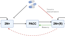 The 2N+ dynamics emerge from the following. We assume logistic growth, in which cells in the 2N+ state are inhibited equally by cells in the 2N+ and PACC states, until they reach their carrying capacity. We allow for an obligate (constant) transition of cells to the PACC state, an assumption supported by experimental literature that observes a baseline level of PACCs in most cancer cell populations5. We let drug induced mortality take on a Michaelis–Menten form, in which mortality is a decreasing function of resistance. We also include a facultative or condition-dependent transition to the PACC state. The higher the death in 2N+ cells due to the drug, the greater their transition rate to the PACC state. These facultative transitions are observed experimentally, with an increase in PACC frequency and number upon administration of therapy22. Finally, we imagine a constant transition rate of cells from the PACC state into the 2N+ state. Note that since we assume cells in the PACC state are 4N+ in ploidy, a depolyplodization event produces two 2N+ cells.