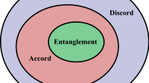 For the purpose of connecting uncertainty relation (2) with the degrees of nonlocality, we define normalized probability by \({\mathcal {P}}_k^n={\mathcal {F}}_k^n/\max \left[ {\mathcal {F}}_k^n\right]\), where \(\max \left[ {\mathcal {F}}_k^n\right]\) corresponds to algebraic maximum of \({\mathcal {F}}_k^n\). The corresponding uncertainty is measured by the Shannon entropy, \({\mathcal {H}}_k^n= - {\mathcal {P}}_k^n \log 2\left[ {\mathcal {P}}_k^n\right] - (1-{\mathcal {P}}_k^n) \log 2\left[ 1-{\mathcal {P}}_k^n\right]\). Therefore, \({\mathcal {H}}_k^n\) determines the degree of uncertainty of the event \(V_k(a,\,b|i,\,j)\), which corresponds to the correlation between Alice’s and Bob’s outcomes a and b. For entanglement, steerability and Bell nonlocal correlation \({\mathcal {H}}_1^3 > 0.92\) (corresponds to the inequality (5), \({\mathcal {F}}_1^3 > 2\) and \(\max \left[ {\mathcal {F}}_1^3\right] =3\)), \({\mathcal {H}}_2^3 > 0.98\) (corresponds to the inequality (3), \({\mathcal {F}}_1^3 > \sqrt{3}\) and \(\max \left[ {\mathcal {F}}_2^3\right] =3\)), \({\mathcal {H}}_3^2 > 1\) (corresponds to the inequality (4), \({\mathcal {F}}_1^3 > 2\) and \(\max \left[ {\mathcal {F}}_3^2\right] =4\)), receptively. As a result, higher degree of nonlocality implies larger threshold value of uncertainty of the condition \(V_k(a,\,b|i,\,j)\).