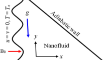 Two curved walls with shapes of wavy and rectangular have been involved in present study as shown in Fig. 1. The water was mixed with two shapes of nanoparticle (CuO) and to incorporate the modeling, single phase technique was chosen53. The curved walls are cold and there exist two adiabatic walls, too. The associated terms of velocity have been discarding in mathematic model because of its low efficacy in freezing. Thus, the related equations for modeling are53: