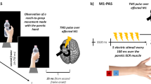 The PMv-M1 is a hierarchically organized neural network primarily involved in fine motor control of sensory-guided actions such as grasping and manipulating objects19,20, but has also been implicated in several other functions including action imitation21,22, processing of observed actions23,24,25 and action-related language26,27,28. Of particular relevance to the present research, prior studies have established the temporal properties of the PMv-to-M1 pathway, by showing that a conditioning TMS pulse over PMv results in a modulation of MEPs induced by a second pulse over M1 when an ISI of 8 ms is used29,30. Accordingly, previous ccPAS studies targeting the PMv-to-M1 pathway have selected an 8-ms ISI to repeatedly and coherently couple pre- and post-synaptic activity—optimal for inducing STDP2,11,14.