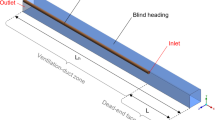 where \({v}_{m}\) represents axial velocity of the turbulent jet, m/s; \({v}_{0}\) represents the velocity of air outlet, m/s; \(\alpha \) represents the turbulence coefficient, 0.08 for round pipe; \(S\) represents the distance from the ventiduct mouth, m; \({d}_{0}\) represents the diameter of the duct, m.