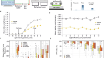 where \({\uptau }_{i}\) is the time constant, \({r}_{i}\left(\ge 0\right)\) is the cell activity level, \({\mathrm{V}}_{0,i}\) is the threshold for activation, \({s}_{i}\) is the stimulus input, \({r}^{\text{max}}\) is the maximum value of \(r\), and \({\mathrm{A}}_{\mathrm{ij}}^{\text{ex}}\) and \({\mathrm{A}}_{ij}^{\text{in}}\) are the excitatory and inhibitory connection strengths from neuron \(j\) to neuron \(i\), respectively. The subscripts here correspond to the neuron categories shown in Fig. 1 as follows: 1: Ch, 2: B1, 3: B2, 4: iLNb, 5: iLNa, 6: Ha, and 7: Hb. The units of time \(t\) are arbitrary units (AU), as in Jovanic et al.32.