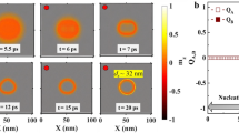 As stated before, we aim in this section to present and discuss the main numerical results obtained by using the micromagnetic simulation. Our purpose consists in investigating first the nucleation of an isolated AFM skyrmion by locally injecting a pure spin (spin-polarized) current perpendicular-to-plane of a 2D AFM layer. In Fig. 3a, we nucleated an AFM skyrmion in a 2D layer with an AFM ground state via spin-transfer torque (STT) by locally injecting a pure current perpendicular-to-plane (CPP) of the racetrack memory (See supplementary movie 2). We began with an AFM configuration with DMi strength of 0.45 mJ/m2 then we injected a perpendicular spin-polarized current of \(1\times {10}^{13}\mathrm{A}/{\mathrm{m}}^{2}\) towards a circular region in the AFM layer defined with a diameter of d \(=\) 45 nm as indicated at 0 ps in Fig. 3a. We continue to inject the spin-polarized current perpendicularly into the current-injected region. Subsequently, we observe at 0.5 ps that the STT induces spin-flip in the target area, resulting in spin precessional motion in the AFM material. At 5.5 ps, we switched off the current pulse and stabilized the energies by relaxing the system to minimize the DMi and AFM exchange energies. After the relaxation time, we succeeded to stabilize numerically the AFM thin film with an AFM skyrmion observed in the target area with an ultrafast nucleation time reaching 5.5 ps and a skyrmion diameter of \({\mathrm{d}}_{\mathrm{s}}=35\) nm (see Fig. 3a). In Fig. 3b, we plotted the time development of the topological charges \({\mathrm{Q}}_{\mathrm{A}}\) and \({\mathrm{Q}}_{\mathrm{B}}\) corresponding to the sub-lattice (A) and sub-lattice (B) in the AFM monolayer during and before the nucleation time. As we notice in the nucleation process, the topological charges equal zero for both sublattices. However, once the current pulse is turned off, we observe the creation of the AFM skyrmion, therefore the topological charge develops suddenly to a fixed value (\({\mathrm{Q}}_{\mathrm{A},\mathrm{B}}=\pm 1\)) after an ultrafast nucleation time of 5.5 ps which confirms the topological characteristic of the AFM skyrmion. It should be noticed that the relaxation period was not included in Fig. 3. We illustrated in Fig. 3c the final configuration of the AFM skyrmion obtained numerically by a perpendicular spin-polarized pulse of \(1\times {10}^{13}\mathrm{A}/{\mathrm{m}}^{2}\) with a lateral view of the AFM skyrmion spin texture sliced along the y-axis into the skyrmion core (See supplementary movie 3). Similarly, we nucleated the FM skyrmion in a FM monolayer by applying a perpendicular spin-polarized current of \(1\times {10}^{13}\mathrm{A}/{\mathrm{m}}^{2}\) towards a circular area in the FM layer defined with a diameter of d \(=\) 45 nm (Fig. 3d). It is noteworthy to mention that different nucleation times were tested. As a result, we found that for long nucleation times, the AFM skyrmion did not reveal in these cases; instead, the spin-polarized current induced large chiral DWs along the y-axis. For short nucleation times (below 5.5 ps), the system does not acquire enough energy to generate AFM skyrmions, and hence, the spin direction of each sublattice returns to its initial orientation after minimizing the DMi and AFM exchange energy.