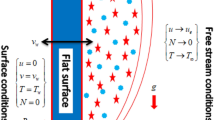 In the above equation, \({\sigma }^{*}\) represents the Stefan Boltzmann constant such that \({\sigma }^{*}=5.66970\times {10}^{-8}\;\;\text{W{m}}^{-2}{\text{K}}^{-4}\), whereas \({k}^{*}\) represents the mean absorption coefficient. Accordingly, Eq. (7) is reduced to the following form: