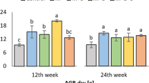 During composting procedure, chicken manure showed its temperature raise to 65–75 °C after 3 days. The compost was turned over twice times in the first week and changed to one time from the second week. Compost samples were collected at 0, 2nd, 4th, 6th and 8th week for analysis. Table 1 showed that pH of chicken manurewas 7.8 at first. However, it decreased along with composting time and reached about 7.1 after 8 weeks. The organic matter content was 92.5% originally and decreased to 64.0% after 8th week composting, however, the humic acid increased following composting time 3124. Carbon content of chicken manure was decreased from 58.1 to 43.3% and nitrogen content decreased from 2.45 to 2.2%. By way of calculating, C/N ratio decreased from 23.7 to 19.7, indicating it was mature gradually. Commonly, the compost was mature in case of C/N ratio below20,28. On the other hand, Increasing with composting time, P, K, Ca, Mg, Fe, Mn, Cu, Zn and Na all gradually increasing. Table 2 showed pH of cattle manure was 7.3 at first and reduced to 7.1 after 8 week composting. Organic matter content decreased from 91.3 to 55.2% and humic acid increased from 1.91 to 3.25% after 8 weeks composting. C/N ratio decreased to below 20, representing that the cattle manure was matured. P, K, Ca, Mg, Fe, Mn, Cu, Zn and Na contents of cattle manure were all significantly increased following composting time. Table 3 showed that pH of pig manure was 7.2 before composting and decreased from 88.8 to 61.1% and humic acid increased from 0.7 to 2.5%. Carbon content decreased from 61.2 to 48.6% and nitrogen increased from 23.3 to 2.45% after composting 8 week. Contents of P, K, Ca, Mg, Fe, Mn, Cu, Zn and Na all increased significantly following composting time. C/N ratio decreased from 26.3 to 19.8. After 8 weeks, the ratio was below 20 which representing the pig manure was mature. Table 4 showed that pH was slighly acidic for soybean manure before composting, however, it decreased following composting time. The organic matter content decreased from 90.2 to 67.0% after 8 weeks. Humic acid increased from 0.47 to 1.26%. The content of carbon decreased from 55.1 to 47.0% and nitrogen increased from 5.04 to 5.33%. The contents of P, K and Na were not sable along with composting time. There was an increasing trend for Ca, Mg, Fe, Mn, Cu and Zn. As soybean manure contained high nitrogen content, the C/N ratio was below 20 originally and decreased slightly along with composting time. Table 5 showed that pH of lemon peel waste was slightly acid before composting and had an increasing trend was observed due to the decomposition of organic acid in the lemon peel. The organic matter decreased from 90.2 to 58.9% and humic acid increased from 1.3 to 4.9%. The content of carbon decreased from 71.7 to 58.1% and nitrogen increased slightly from 2.62 to 2.94%. There was an increasing trend for P, K, Ca, Mg, Fe, Mn, Cu, Zn and Na following composting time. The C/N ratio was decreased from 27.4 to 19.8 after 8 weeks, hence, the lemon peel compost was mature.