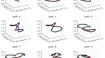 This great variability may explain the hardship to get accurate results when modeling the CoM trajectories of two humans walking with a table. In Maroger et al.22, an IOC scheme was used to build an OC model which accurately fits average CoM trajectories of single walking humans. In this paper, we applied the exact same method to investigate if an identical approach could provide similar results and build a coupled OC model to simultaneously simulate two humans handling a table. The generated trajectories could be considered as consistent as they are, most of the time, included in the corridors of observed trajectories. However, this model could not succeed in generating accurate human-like CoM trajectories. Indeed, we hypothesized that the model can be considered as accurate if the mean distances between the generated and the average measured trajectories are of the same order of magnitude than the mean distances between the individual and the average measured trajectories. According to this assumption, even if the results for the forward path along the \(\vec {x}\) and \(\vec {y}\) axis were suitable, the results for orientations and the return paths were not accurate enough. Thus, the starting hypothesis stating that we could model pairs of humans carrying a table with the same method used to model single walking humans turned out to be wrong. Indeed, the method, which worked well to model22 and even predict23 a single human behaviour, did not succeed in building an accurate model for two humans walking with a table. It was not totally unexpected as two humans carrying a table were not two independent holonomous systems coupled through a table. Their interactions may not just be haptic interactions but some other non-verbal interactions may play a role during the carriage task. For example, they may induce sudden changes in the implemented strategy resulting in unusual behaviours. As it could be expected, those potential interactions were not taken into account in the OC model. Moreover, the inaccurate results may also be due to the great range of behaviour observed during the experiments. The different average trajectories may reflect inconsistent behaviours which resulted in an impossible fitting of the average trajectories with on single set of weights. However, when trying to fit the individual measured trajectories performed by one pair instead of the average trajectories, this problem remained as one pair also displayed a too great range of behaviours as Fig.7c shows. Moreover, as better results were obtained for the forward path, the hypothesis made for the return paths may be wrong: the subjects’ roles may not be switched between the forward and the return paths. One solution may be to compute time-varying weights in order to identify changes in the subjects’ behaviour. Changing the dynamics of the system to model both subjects as a mass spring system might also be better than coupling the subjects with weak constraints put in the cost function. Indeed, low weights were assigned to the exponential barriers implemented in this manuscript. This means that the constraints they represented were not always observed. Another solution might be to remove outlier trajectories before computing the average trajectory. This might provide a model which fits the trajectories of pairs which have the most homogeneous behaviour. Thus, the main conclusion of this inaccurate modeling was that two interacting individuals cannot be modelled using the same optimization criteria that were used to model a single individual. The haptic interactions seemed to induce a change in the subjects’ behaviour which made them fundamentally different from one single walking subject and, thus, less predictable. To conclude, during the recorded interaction, the collaborating subjects set aside their individual behaviour to achieve a less predictable collective behaviour. As the model was unable to generate accurate trajectories for at least one scenario, we chose not to present the results regarding Scenario 1 and 2 as we can already state that this approach was not relevant to model pairs during collaborative carriage tasks.