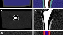 Different scan protocols were evaluated while varying prefiltration, tube voltage and tube current-exposure time products. Thirty-two scans of the cadaveric wrist with volar locking plate fixation were performed in UHR mode. A total of 15 UHR-CBCT scans were evaluated with tube voltage ranging from 60 to 133 kVp and tube current-exposure-time products of 0.6 mAs, 1.2 mAs and 2.5 mAs. Of note, the CBCT system’s standard hardware does not include the option for tin prefiltration. The protocols for matching UHR-MDCT scans (15 matching MDCT protocols) were set up with tube voltage ranging from 70 to 140 kVp with reference mAs designed to equal CTDI values of their CBCT counterparts. Additionally, two protocols (100 kVp and 150 kVp) with 0.4 mm tin prefiltration were employed, resulting in a total of 19 MDCT protocols. Detailed scan parameters for CBCT and MDCT protocols are summarized in Table 1. For comparison of applied radiation doses between CBCT and MDCT, the volume computed tomography dose index for a 16 cm phantom (CTDIvol) was evaluated. Dose-length products and CTDIvol were noted to estimate the radiation dose in MDCT. CTDIvol-equivalent values for CBCT were computed by multiplying the dose-area product by a linear scaling factor provided by the manufacturer based on previous phantom measurements. The scaling factor was determined in advance for every combination of acquisition geometry, tube voltage and beam filtration (e.g. copper filter). The dose-length product was measured in five chambers of a conventional polymethyl methacrylate dosimetry phantom (IEC 60601-2-44:2009) with a diameter of 160 mm, a length of 300 mm and a standard dosimetry system (Nomex Dosimeter, PTW, Freiburg im Breisgau, Germany) with a 300 mm ionisation chamber. Standard weighting scheme for dose measurements was applied to acquire volume dose-length product values (DLPvol). CTDIvol values were calculated by dividing DLPvol values by the field of view in the z-direction, which is equivalent to the beam width. Finally, the scaling factor was computed by dividing CTDIvol by dose-area product values. Dose-area products for all examinations were extracted from the automatically created scan report.