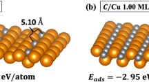 The carbon cluster was placed on either Sr, Ti or O atom on SrTiO\(_{3}\)(001) surface as an initial condition. The evaluated absorption energies are shown in Table 2. Figure 3 shows schematics of optimal supercell of carbon cluster (nanographene) placed on (a1) SrTiO\(_{3}\)(001) and (b1) Si(001) surface. Both supercell showed bent surface of nanographene. The absorption energy of nanographene placed on SrTiO\(_{3}\) showed \(\sim \) 570 kJ/mol on the Sr, Ti and O atoms. On Al\(_{2}\)O\(_{3}\) surface, absorption energy was estimated to be 950 kJ/mol in nanographene placed on either aluminum or oxygen atom. The adsorption energies were almost the same on each atom, and independent of where nanographene was placed on the surface. Since nanographene can be flatly distributed on the surface of SrTiO\(_{3}\), Al\(_{2}\)O\(_{3}\) and MgO, graphene seems to grow on those surfaces.