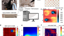 ToF–SIMS analysis combined with Partial Least Square (PLS) regression has been demonstrated as a powerful tool for corelating surface chemistry represented in mass spectra with a univariate data set such as bacterial attachment to surface38,39. This method was used here to unveil correlations between the surface chemistry of the test materials and viral retention represented by mean fluorescence intensity, and to identify key surface moieties for viral attachment. The data collected from all the 17 materials were split into training and test sets (13:4), and LASSO regression was used to remove uninformative descriptors, and PLS performed with 2 latent variables (minimise root mean square error of cross-validation). The PLS regression model produced by this analysis successfully predicted viral retention from the ToF–SIMS spectra, as evidenced by the linear relationship between predicted and measured retention with an R2 value of 0.84 and 0.87 for the training and test sets (Fig. 5a). This indicates that the surface chemistry of the PPE as measured by ToF–SIMS partially correlates with the strength of viral adsorption to a material. Four key ions, which gives the highest influence on viral retention quantified by the absolute value of PLS regression coefficients, were identified, where three negative values at m/z 31.98 (−), 196.93 (−) and 394.33 (+) mean these ions correlated with resistance to viral retention, while the positive value at m/z 101.03 (+) means this ion correlated with promotion of viral retention (Fig. 5b). The relative intensity of the four key ions in ToF–SIMS spectra for the test materials are shown in Fig. 5c, where darker colour indicates higher signal intensity. Putative assignments of these four key ions are listed in Fig. 5d, which were selected by their low deviation from the peak position and their chemical plausibility. (Table S2) The negative ion at m/z 31.98 was assigned to S−, (Fig. 5e) which correlated to the low viral retention of the materials with sulfur containing ions identified in the ToF–SIMS analysis, including latex gloves, nitrile gloves, vinyl gloves and PC. The ion at m/z 196.93 (−) correlated to the low viral retention of PC, PE apron, neoprene gloves, nitrile gloves and latex gloves, the assignments of which aligned with the existence of sulfur containing components that were possibly from the addition of common manufacturer additives. The ion at m/z 394.33 (+) correlated to the low viral retention of PC, Scrub 2, Virustatic shield and PE apron, and possibly from the addition of surfactants with a long hydrocarbon chain and hydrophilic moiety. The ion peak at m/z 101.03 (+) were found in PET visor (O), PET visor (I), PS, PU and PTFE giving relatively high intensity, putatively assigned to a nitrogen containing ion, and correlated to the high viral retention. Again, the putative assignments of these ions indicate that common additives may be added in the manufacturer process. In general, PLS regression successfully demonstrated the correlation between four key ions: m/z 31.98 (−), 101.03 (+), 196.93 (−) and 394.33 (+) identified in ToF–SIMS spectra and viral retention under air flow challenge. However, the produced model is limited for making future predictions due to (1) the low range of performance of the test materials, (2) the diversity of unknown components due to the manufacturer process and (3) the relatively limited type and number of materials used to construct the model.
