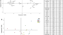 Table 4 shows the loadings for the first two principal components. Overall, component 1 was mainly characterized by positive loadings data, in particular C20:2n−6 (0.933), C18:2n−6 (0.919), C17:0 (0.889), C20:1c11 (0.862), C18:1c11 (0.856), C15:0 (0.846), C18:2t9t12 (0.834), C16:0 (− 0.810) and total carotenoids (− 0.805), while the component 2 was mainly characterized by negative loadings data, in particular C18:0 (− 0.624), C22:0 (− 0.624). C16:1c7 (− 0.499) and C20:3n−6 (0.486).