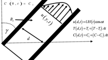 In this research, we study the electro-osmosis-induced unsteady MHD flow of the Sodium Alginate-based Casson fluid in a vertically inclined microchannel. The direction of the fluid flow is along x-axis. The flow of the fluid is in an inclined microchannel to maintain irregular zeta potential \(\zeta_{1} ,\,\,\zeta_{2}\). The magnetic field \(B_{0}\) is also applied to the fluid with the angle of inclination. Firstly, the fluid is at rest with ambient temperature \(T_{0}\) and constant concentration \(C_{0}\). After a period of time, the concentration and temperature are increased to \(C_{0} + (C_{d} - C_{0} )At\) and \(T_{0} + (T_{d} - T_{0} )At\) respectively as shown in Fig. 1.