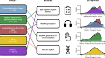 The underlying biology of the cross-trait relationship between rhythmic perception and grammatical skills, especially in light of proposed shared evolution, could be explained by genetics—both through shared genetic architecture60,81 between human rhythm and grammatical traits, and through evolution of hierarchical processing as a common mechanism to process syntax in both music and grammar82. Developmental observations in musicality and language skill further support the case for common genetic influences on these traits, perhaps that are ontogenetic. Although as adults we might consider musical rhythm and speech highly dissimilar83, evidence collected from studies with infants looking at language discrimination, speech tracking and rhythmicity84,85, melodic complexity of crying and language acquisition86,87,88, and familiarity with musical rhythms and words89 might indicate that development of rhythm and grammatical skills is concomitant rather than sequential.