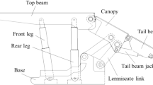 In Fig. 12, the calculation results of the advanced hydraulic support pose model are basically consistent with the kinematic simulation results when the base of the advanced hydraulic support is in the horizontal state. The calculated value coincides with the simulated value in the range of 3–4 s. The error of the support height is less than ± 6 mm, and the average absolute error is 2.92 mm throughout the lifting process. The established advanced hydraulic support space attitude model can accurately feedback the advanced hydraulic space attitude information.
