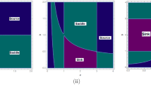 Let \(R_{1}\) and \(R_{2}\) be two roots of (6). We recall some definitions of topological types for a fixed point p(x, y). p(x, y) is called a sink if \(\left| R_{1}\right| <1\) and \(\left| R_{2}\right| <1\). A sink is locally asymptotic stable. p(x, y) is called a source if \(\left| R_{1}\right| >1\) and \(\left| R_{2}\right| >1\). A source is locally unstable. p(x, y) is called a saddle if \(\left| R_{1}\right| <1\) and \(\left| R_{2}\right| >1\) (or \(\left| R_{1}\right| >1\) and \(\left| R_{2}\right| <1\)). And p(x, y) is called non-hyperbolic if either \(\left| R_{1}\right| =1\) or \(\left| R_{2}\right| =1\).