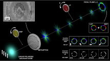 Here, the required intensity projections, which represent the horizontal, vertical, diagonal and right-circular polarization components are represented by \(I_{H}\), \(I_{V}\), \(I_{D}\) and \(I_{R}\), respectively. Such intensities can be experimentally measured through a series of phase retarders inserted in front of the CCD camera. More specifically, we measure the \(I_{H}\), \(I_{V}\) and \(I_{D}\) by passing the generated beam through a polarizer oriented at \(0^\circ \), \(90^\circ \) and \(45^\circ \), respectively, while \(I_{R}\) is measured by inserting a QWP at \(45^\circ \) with the polarizer at \(90^\circ \) (see11 for more details). As way of example, we show the experimental Stokes parameters in Fig. 6a, where the reconstructed polarization distribution overlapped with the intensity profile \(S_{0}\) for the specific case \(\Psi _{1,-1}\) at the plane \(z=0\) is represented in Fig. 6b. It is also worth noting that the same amount of right- and left- circular polarized components in this case results in the zero intensity distribution of the Stokes parameter \(S_{3}\) (see right bottom panel in Fig. 6a), that is also the reason that the final reconstructed transverse polarization distribution features with radial linear polarized states (see Fig. 6b).