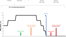 Whole milk samples were collected weekly and analyzed for fat, CP, lactose, and total solids using an infrared spectrophotometer (Foss milk-o-scan, Foss Electric, Hillerød, Denmark). Throughout the study, starter feed intake and total DMI (milk plus starter feed) were determined daily and averaged weekly. Individual BW was recorded at the beginning of the experiment and on days 36, 56 (weaning), and 70 of the study. Average daily gain and feed efficiency (FE = kg BW gain/kg total DMI) were calculated for preweaning, postweaning, and the entire period. Throughout the study, samples of starter feed and refusals were collected every 2 weeks and stored at − 20 °C until chemical analysis. Subsamples of feed and refusals were thoroughly mixed, dried, ground to pass a 1-mm screen in a mill (Ogaw Seiki CO., Ltd, Tokyo, Japan), and analyzed (AOAC13) for DM (Method 925.40), ash (Method 942.05), ether extract (Method 920.39), CP (Method 2001.11), and neutral detergent fiber (NDF) (using heat stable alpha-amylase and sodium sulfite) and acid detergent fiber (ADF) according to Van Soest et al.14, with the Ankom Fiber Analyzer system (Ankom Technology, Macedon, NY). For mineral analysis, diet samples were ground to pass through a 0.5-mm sieve prior to analysis. The samples were then analyzed for Fe, Zn, Mn, Cu, and Co. Mineral content in the feed samples was determined using a ICP-AES after digestion in concentrated HNO3 according to AOAC13. The total concentration of Se and Cr in the feeds was also determined using an inductively coupled plasma mass spectrometry technique. Backfat thickness (BFT) was measured by ultrasound (SonoVet 600 V; BCF Technology Ltd., West Lothian, UK) once a week at the beginning of the experiment and on days 36, 56 (weaning), and 70 of the study, according to Schröder and Staufenbiel15 on an imaginary line between the hooks and pins at the sacral examination site.