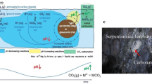It has been suggested that peridotite in seafloors and subduction zones is carbonated and serpentinized30. Case studies from the Oman ophiolite show that peridotites react with CO2-bearing fluids to form large amounts of serpentine and carbonate31,32,33, and with an estimated rate of natural carbonation of about 104–105 tons CO2/yr31 and 106–107 kg CO2/yr33. Residual olivine is surrounded by antigorite and magnesite, and serpentinization and carbonation can occur simultaneously during olivine alteration34. During carbonation, peridotite can be converted into ophicarbonate (carbonate-rich serpentinite), soapstone (talc + magnesite + serpentine) and listvenite (quartz + magnesite and/or dolomite + talc)32,35,36,37,38. Similarly, exposed peridotite can react with seawater (in ancient peridotite-hosted hydrothermal systems) to form serpentine and calcite39. Interestingly, recent studies also suggest that serpentinization and carbonation of minerals are closely related to organic synthesis on terrestrial planets40.